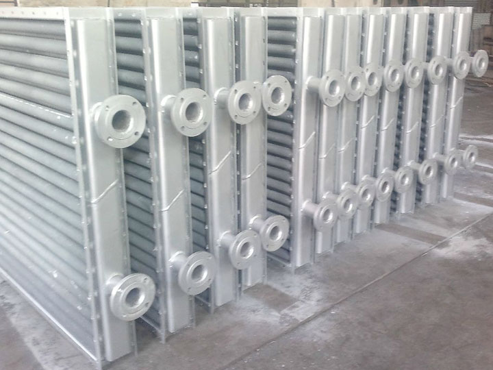 翅片式換熱器主要用于干燥系統(tǒng)中空氣加熱,是熱風裝置中的主要設備,散熱器采用的熱介質(zhì)可以是蒸汽或熱水,也可用導熱油,蒸氣的工作壓力一般不超過0.8Mpa,熱空氣的溫度在150℃以下。
