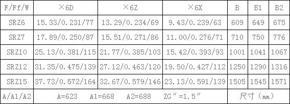 表4、SRZ散熱器散熱面積F(m2),通風(fēng)凈截面積Ff(m2),參考重量W(Kg),有關(guān)尺寸(mm)一覽表