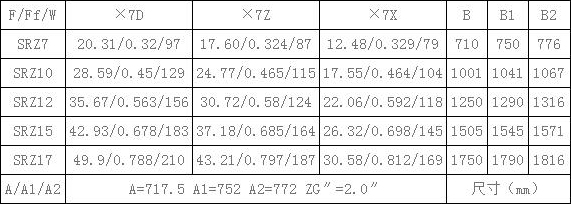 表7、SRZ散熱器散熱面積F(m2),通風(fēng)凈截面積Ff(m2),參考重量W(Kg),有關(guān)尺寸(mm)一覽續(xù)表